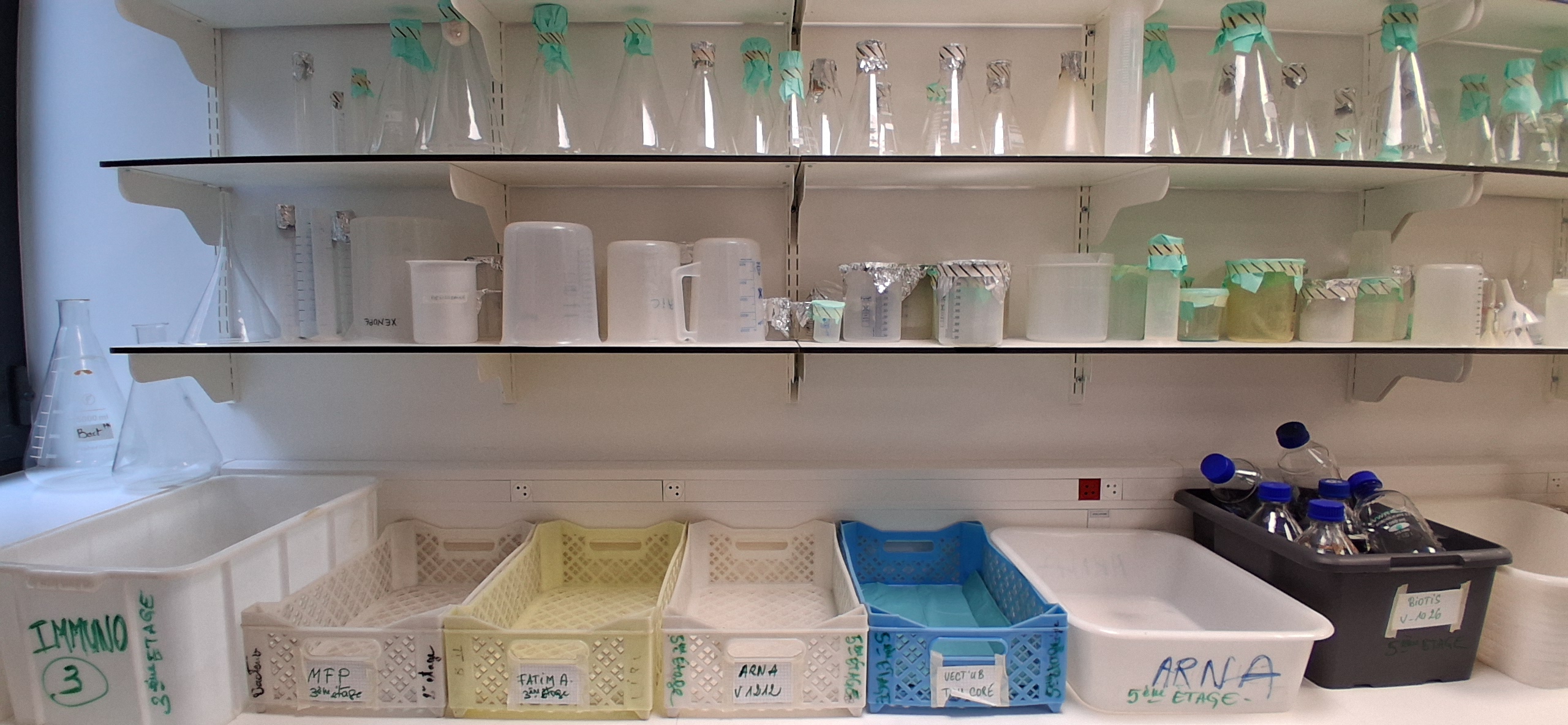 J'ai aussi un temps de laboratoire durant lequel je regagne l'étage de BioTis. A cet étage, j'ai également un bureau que je partage avec Jérôme Ligneron. J'y vais pour y passer mes commandes et gérer l'inventaire des stocks du labo. Là, je peux vérifier mes stocks et ranger le matériel commandé. Je dispose de deux salles de stockage : la première sert d’entrepôt pour les réserves de l’unité, ce qui me permet de réapprovisionner la seconde salle, où les consommables sont triés et organisés par type sur des étagères à destination des personnels de recherche.