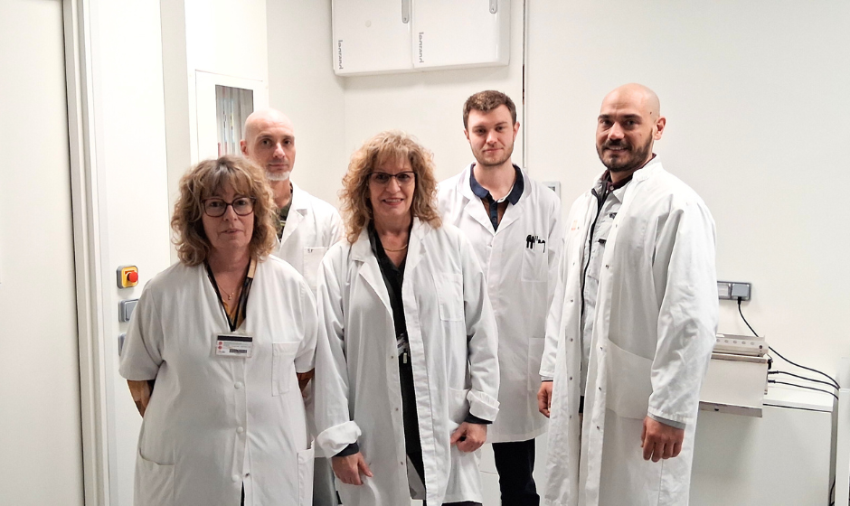 L'équipe laverie du BBS, de gauche à droite : Nathalie Peyron (MFP), Sébastien Fonteyraud (ImmunoConcEpT), Béatrice Auger (BioTis), Kévin Lard (ARNA) et Anthony Cooke (BRIC). Marie Menard (TBMCore) était absente le jour de la photo - © Clémence Faure