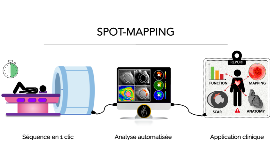 Grâce à la séquence SPOT-MAPPING, moins d’apnées sont demandées au patient, le protocole cardiaque est plus court, le manipulateur radio n'a à paramétrer qu’une seule séquence, et le radiologue voit son analyse simplifiée et accélérée. Dans notre projet, nous avons introduit des modèles d'intelligence artificielle pour assister (et non remplacer) le radiologue dans l’analyse des images (extraction des biomarqueurs). Tous les contours des différentes régions d’intérêt sont déjà tracés, ce qui lui permet de se concentrer pleinement sur son expertise et de consacrer plus de temps à l'établissement du diagnostic.