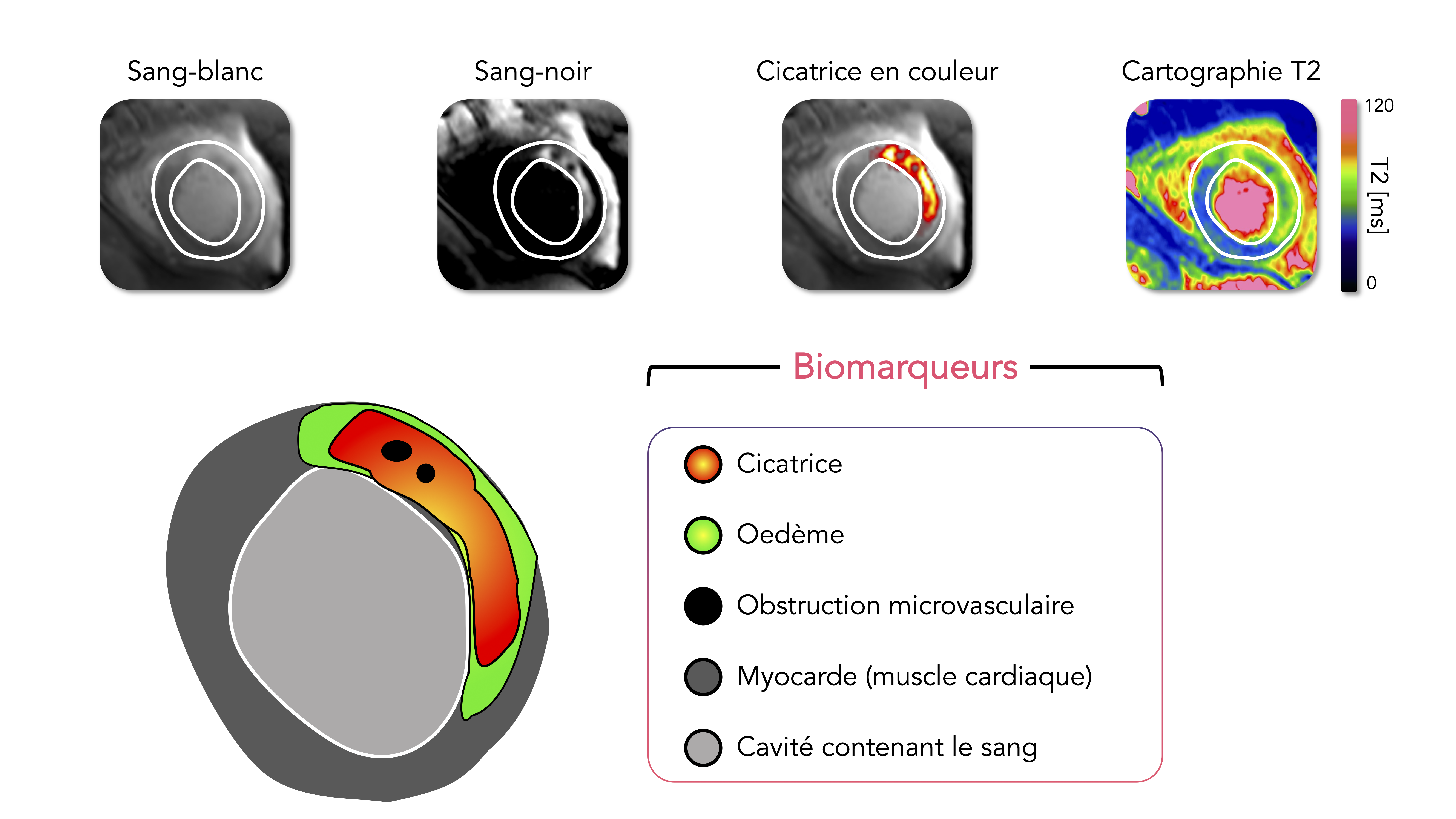 Images de la séquence SPOT-MAPPING avec segmentation du myocarde et représentation des biomarqueurs. Crédits illustration : Victor de Villedon de Naide