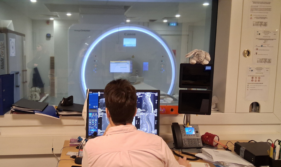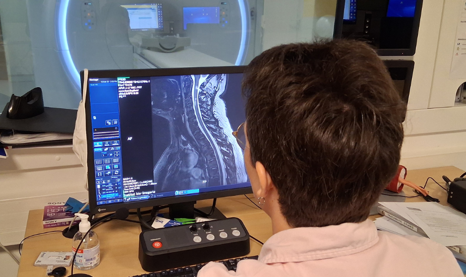 L'autre moitié de mon poste est dédiée à la recherche. Je prends alors la casquette d'ingénieure de recherche et j'écris des papiers sur des études que coordonne généralement Thomas Tourdias ou les cliniciens utilisateurs de l’IRM Canon. Là, par exemple, j'ai soumis un article en tant que dernier auteur sur la problématique de l'obésité et son impact sur les neurotransmetteurs du cerveau. Je fais aussi des études sur la moëlle épinière dans des pathologies comme la SEP. Pour résumer, je participe à toutes les études qui nécessitent de faire de l'analyse d'images obtenues via le Canon 3T. Sur cette partie de mes activités, et à la différence de la précédente, je ne fais pas du tout de manip. C'est encore de la recherche clinique mais je ne fais pas du tout de temps machine : je participe vraiment à étudier les informations issues des clichés IRM et à la réflexion autour de leur optimisation et de leur interprétation. Techniquement manip radio et ingénieur de recherche ne sont donc pas le même métier. Il y a une partie de ma fiche de poste qui est totalement consacrée à la manipulation de l'appareil et une autre qui implique que je fasse du support à la recherche indépendamment de l'IRM en tant que tel.