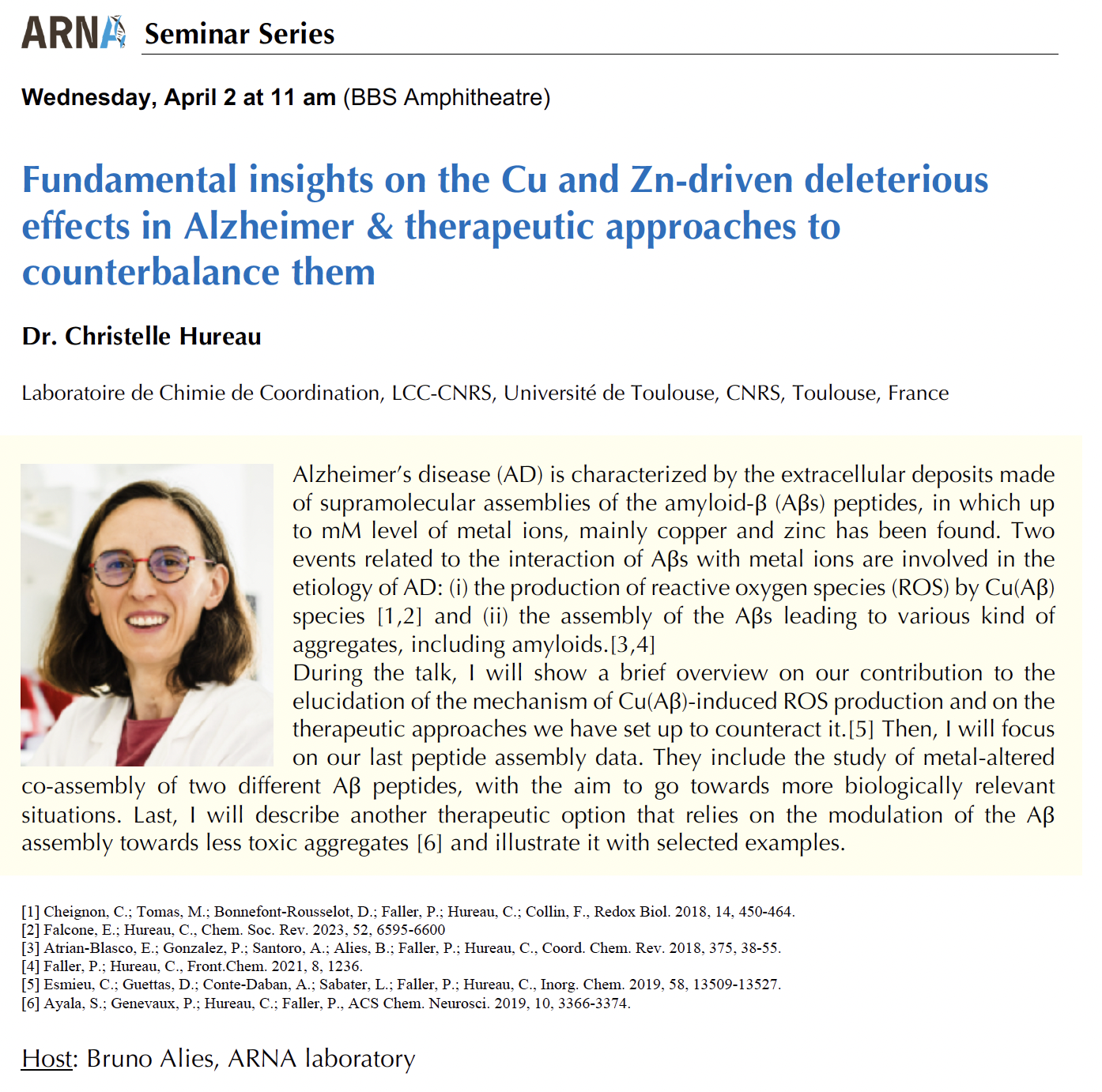 Christelle Hureau présentera la conférence intitulée : "Fundamental insights on the Cu and Zn-driven deleterious effects in Alzheimer & therapeutic approaches to counterbalance them"