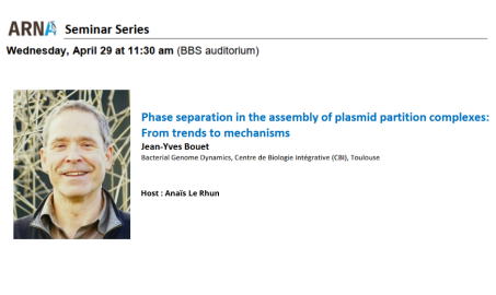 Jean-Yves Bouet présentera une conférence intitulée "Phase separation in the assembly of plasmid partition complexes: From trends to mechanisms".