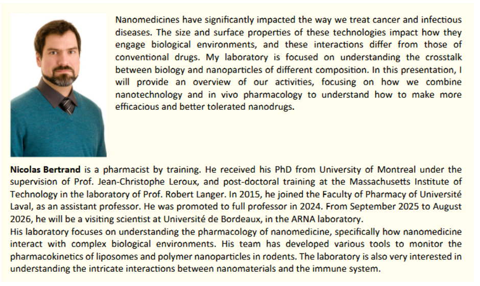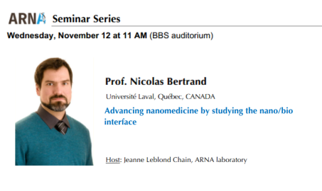 Nicolas Bertrand présentera une conférence intitulée "Advancing nanomedicine by studying the nano/bio interface".