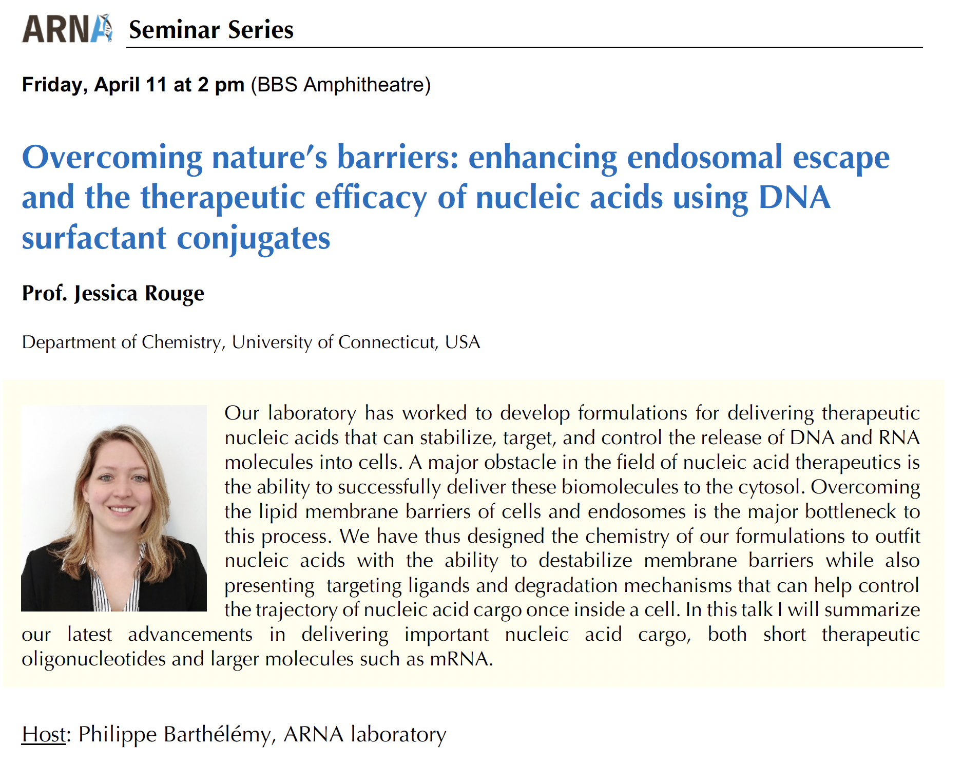 Le Pr. Jessica Rouge est l'invitée de Philippe Barthélémy. Elle présentera sa conférence intitulée "Overcoming nature's barriers: enhancing endosomal escape and the therapeutic efficacy of nucleic acids using DNA surfactant conjugates" à l'amphithéâtre du BBS sur le campus Carreire.