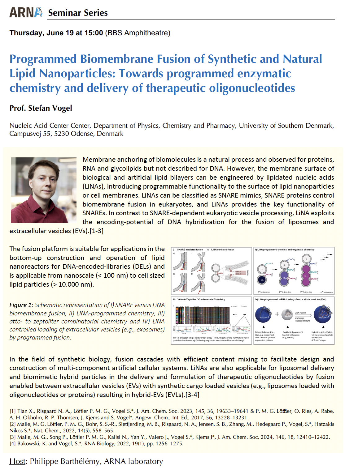 Le Pr. Stefan Vogel présentera sa conférence intitulée "Programmed Biomembrane Fusion of Synthetic and Natural Lipid Nanoparticles: Towards programmed enzymatic chemistry and delivery of therapeutic oligonucleotides"