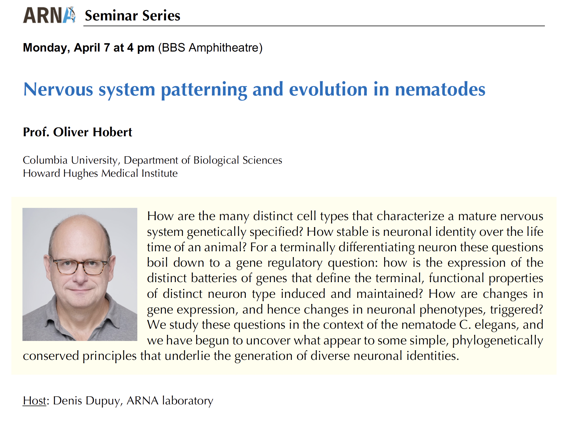 Le Pr. Olivier Hobert présentera sa conférence "Nervous system patterning and evolution in nematodes"