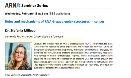 Dr Stefania Millevoi présentera une conférence intitulée "Roles and mechanisms of RNA G-quadruplex structures in cancer".